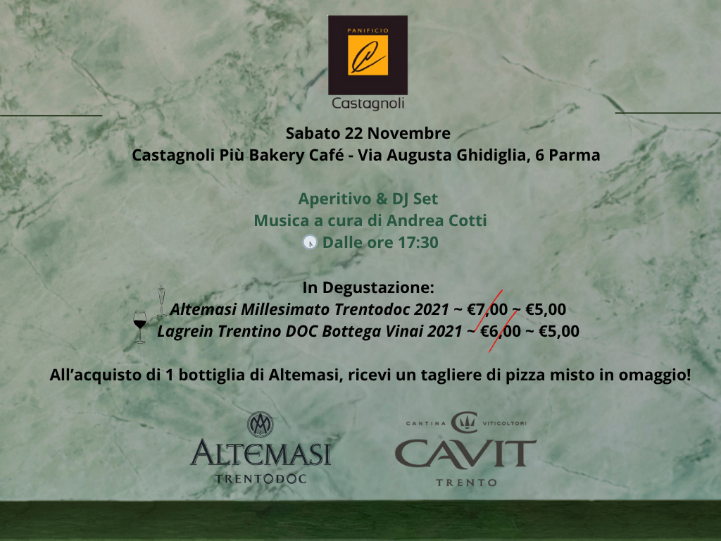 Giovedì 20 novembre, dalle ore 17:30, il Panificio Castagnoli Più (Largo Mercantini 15, Parma) invita a una serata speciale con aperitivo e dj set curato da Andrea Cotti.In degustazione: Altemasi Millesimato Trentodoc 2021 Lagrein Trentino DOC Bottega Vinai 2021 Per info & prenotazioni: + 39 (0521) 944684 Ig: @panificiocastagnolipiu Fb: @panificiocastagnolipiu Sito web: www.panificiocastagnolipiu.com